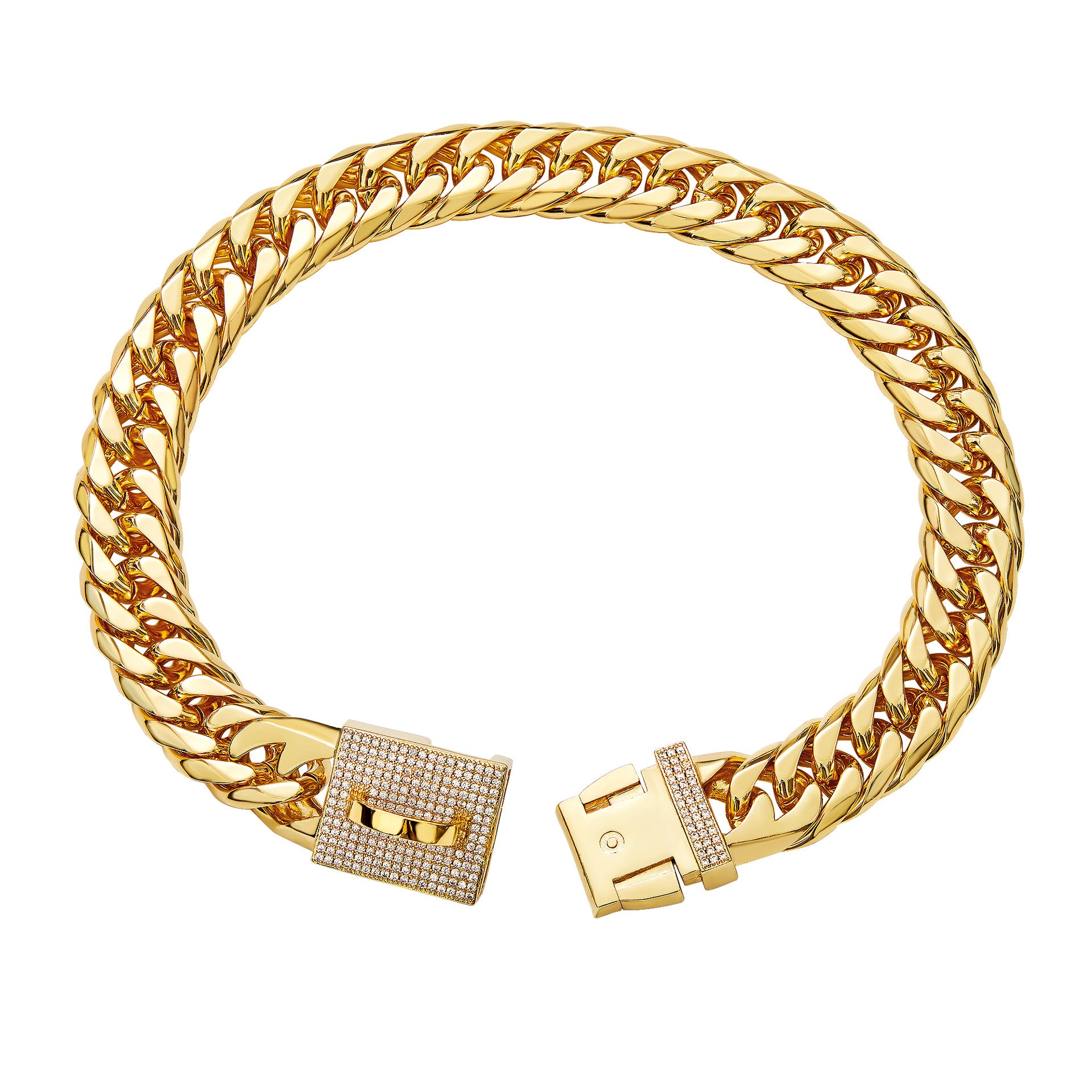 Made with high-quality stainless steel and a double woven chain design, this necklace is durable and long-lasting, ensuring a comfortable and secure fit for your furry companion. The golden finish adds a touch of shine and elegance, making this necklace a must-have for any fashionable pooch.